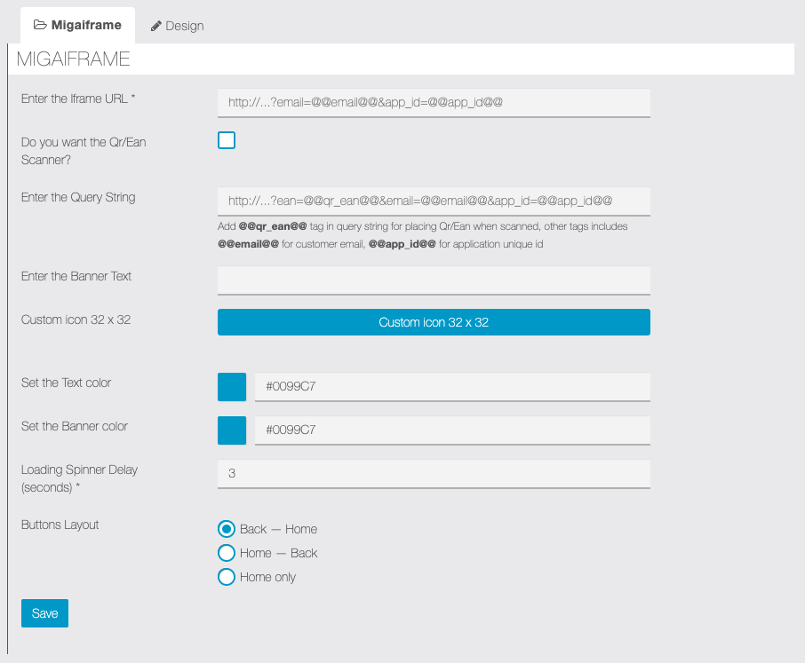 Qui puoi impostare il tuo URL del manuale utente che sarà accessibile dal pulsante ? che troverai nel frontend del App Builder (utile se il modulo sarà attivata a tuoi clienti e non vuoi far vedere il manuale di Migastone)