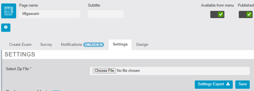 - Zip file Settings – The settings allow users to get the Zip file which includes all the settings of the Exam module. Users can also Import/Upload the zip file.