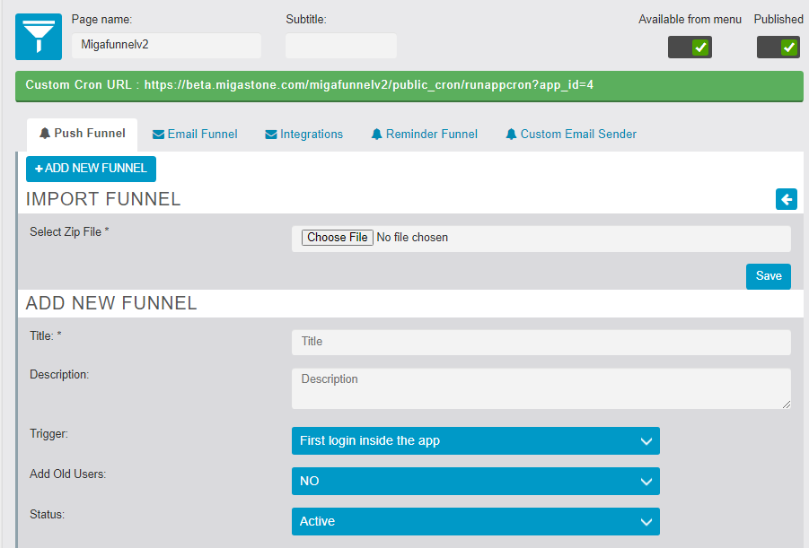 On the Control Panel of Migafunnelv2 feature you can add from separate tabs: