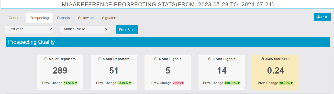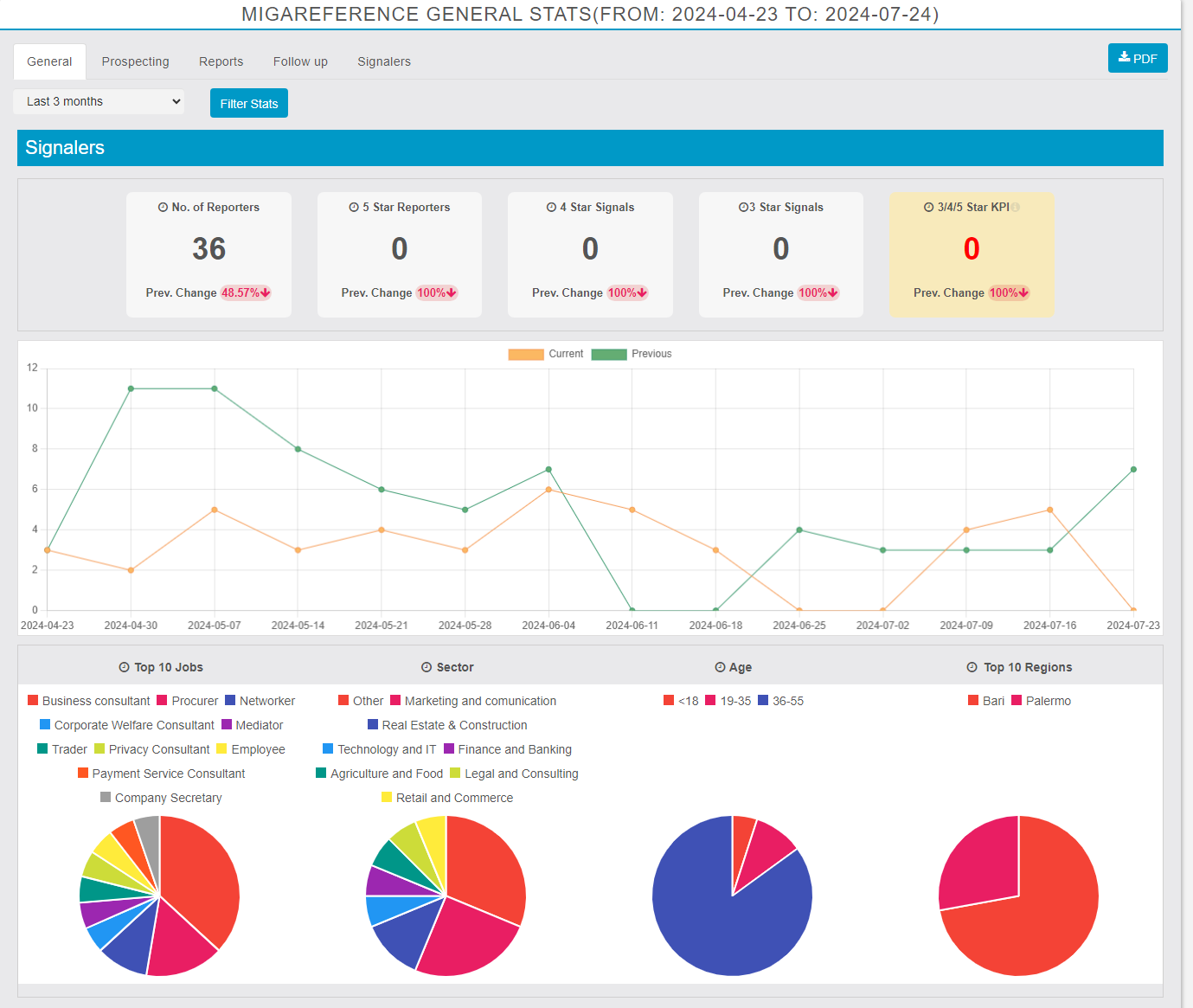 in the same group, divided by the total number of reporters who have made at least one report. The KPI measures how active the reporters are over time and therefore the effectiveness of the follow-up. - Expected Reports is the KPI that tries to predict how many reports we will owe in the near future. The calculation takes into consideration the percentage of Referrers that will be activated, therefore Total Referrers not yet active x the KPI Active Referrers. The calculation only takes into account alerts created between today and twice the average incubation time