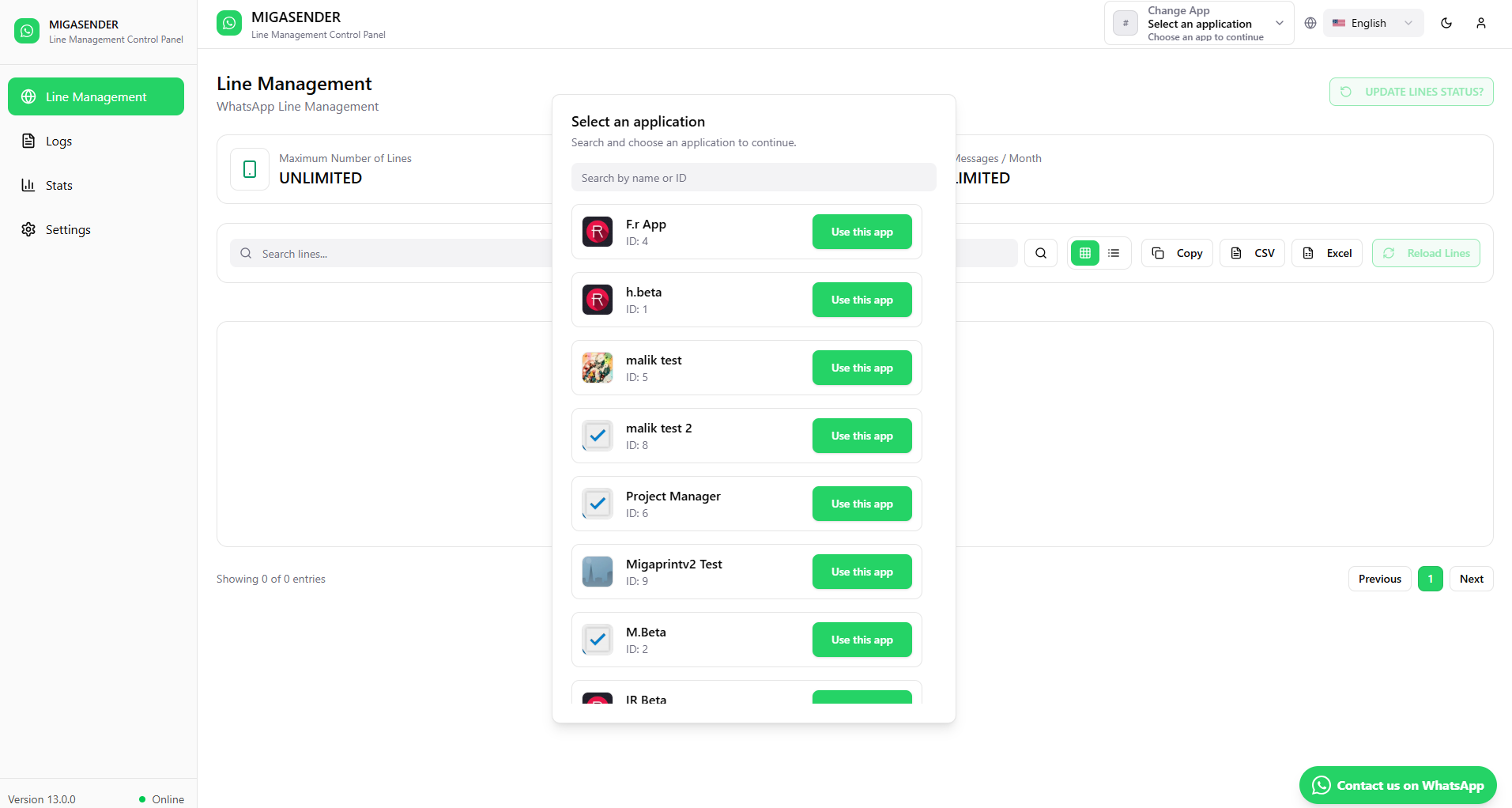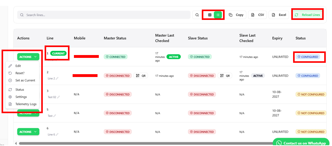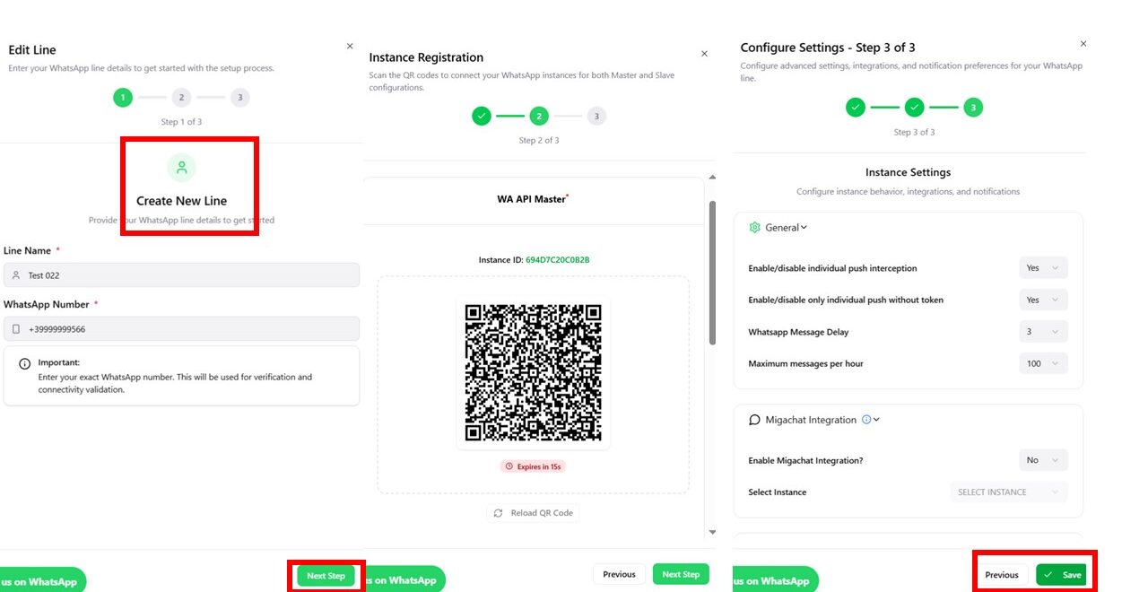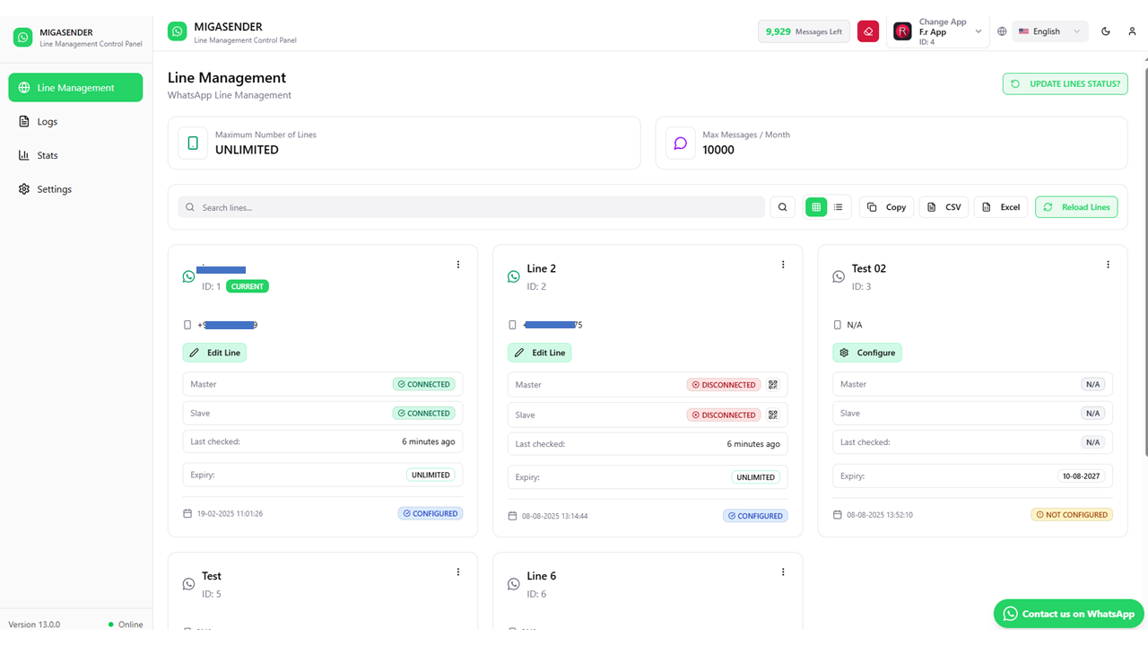 Line management in Migasender is handled through the Migawhatsapp Line Management API. Here’s how it works: