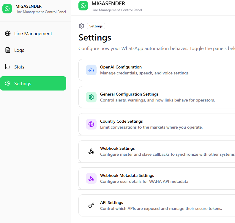 Accessing the Settings Panel: Users can access the settings panel from the Migasender app section. Here they can configure general settings, API integrations, and specific options for Migachat and Migawhatsapp.