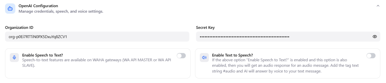 Migachat: The integration with Migachat can be enabled or disabled. Migachat handles user interactions via AI, and the Migachat module must be installed and configured.