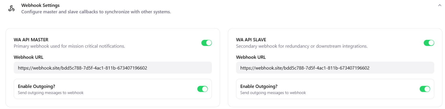 Webhooks: Users can set webhook URLs to receive event notifications. Webhooks can be enabled or disabled without losing existing settings.