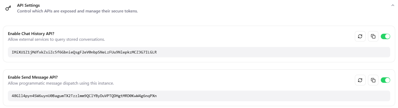 - The Settings that enable the Chat history API Token.