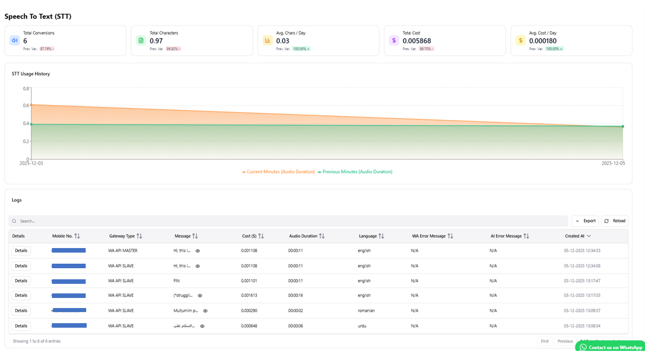 Access to Logs: Users can view the logs of the last 30 chats through the Migawhatsapp module. This includes any errors encountered during interactions.
