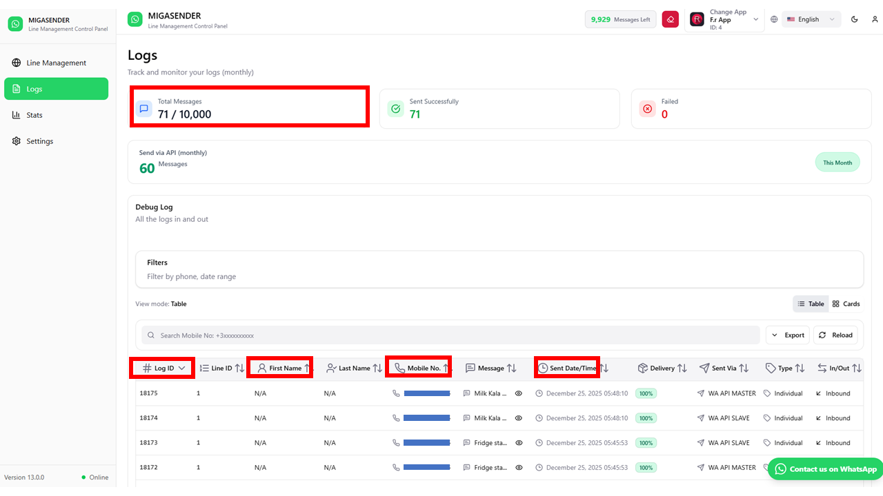 Log Status: Indicates whether the message delivery was successful, resulted in an error, or encountered specific issues such as an “invalid number”.